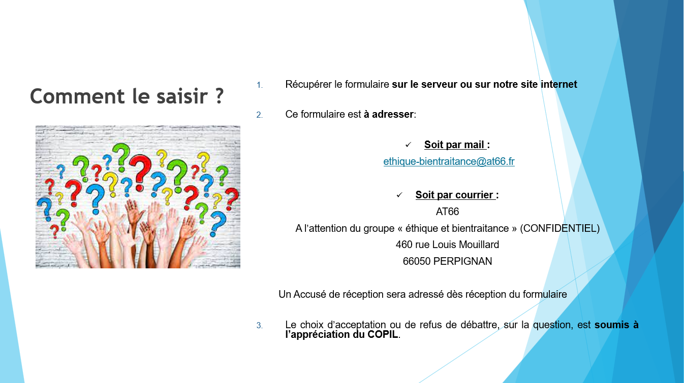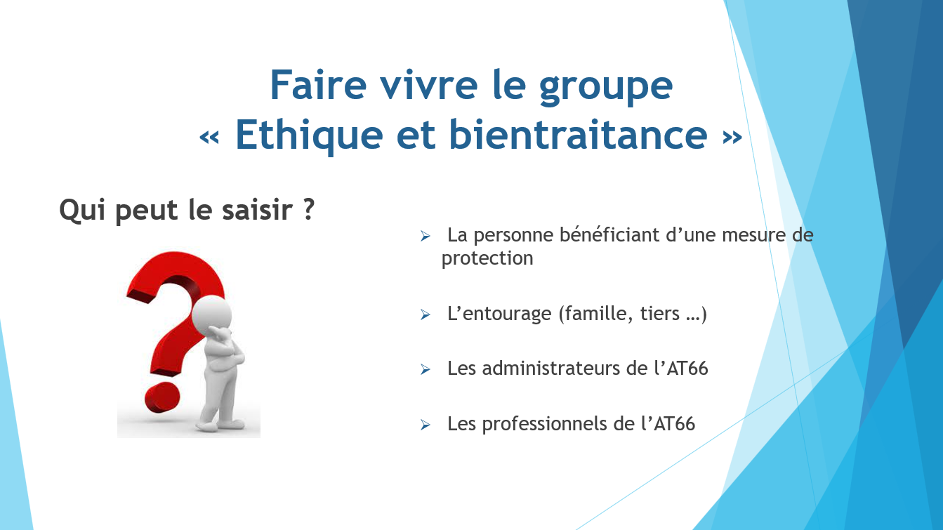 1 - Présentation du groupe Ethique et bientraitance Les activités du groupe Ethique et bientraitance Téléchargez ici la fiche de saisine du groupe éthique et bientraitance Prochain rendez-vous : le colloque à l'automne 2026
